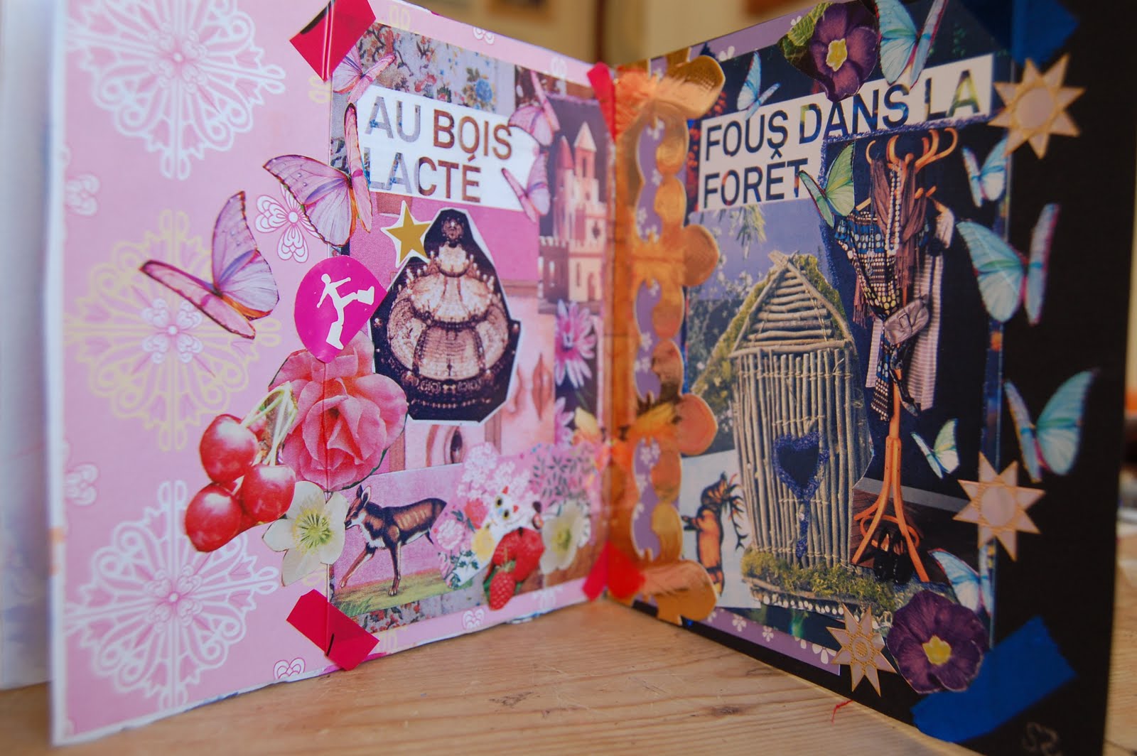 Sonia's pages on the Night and Day sketchbook, given to me this summer in France. Sonia is my most important friend,her birthday is the day before mine and we are alike in many ways, love the same films, music, clothes, decoration ideas... I love her collage, the words mean 'mad in the forest/milky way'...